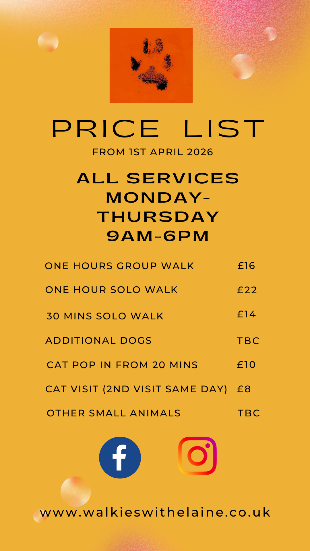 - Solo walks are offered to those dogs who may not be suitable for group walks for any reason. Priced at £20 for one dog for an hours walk.