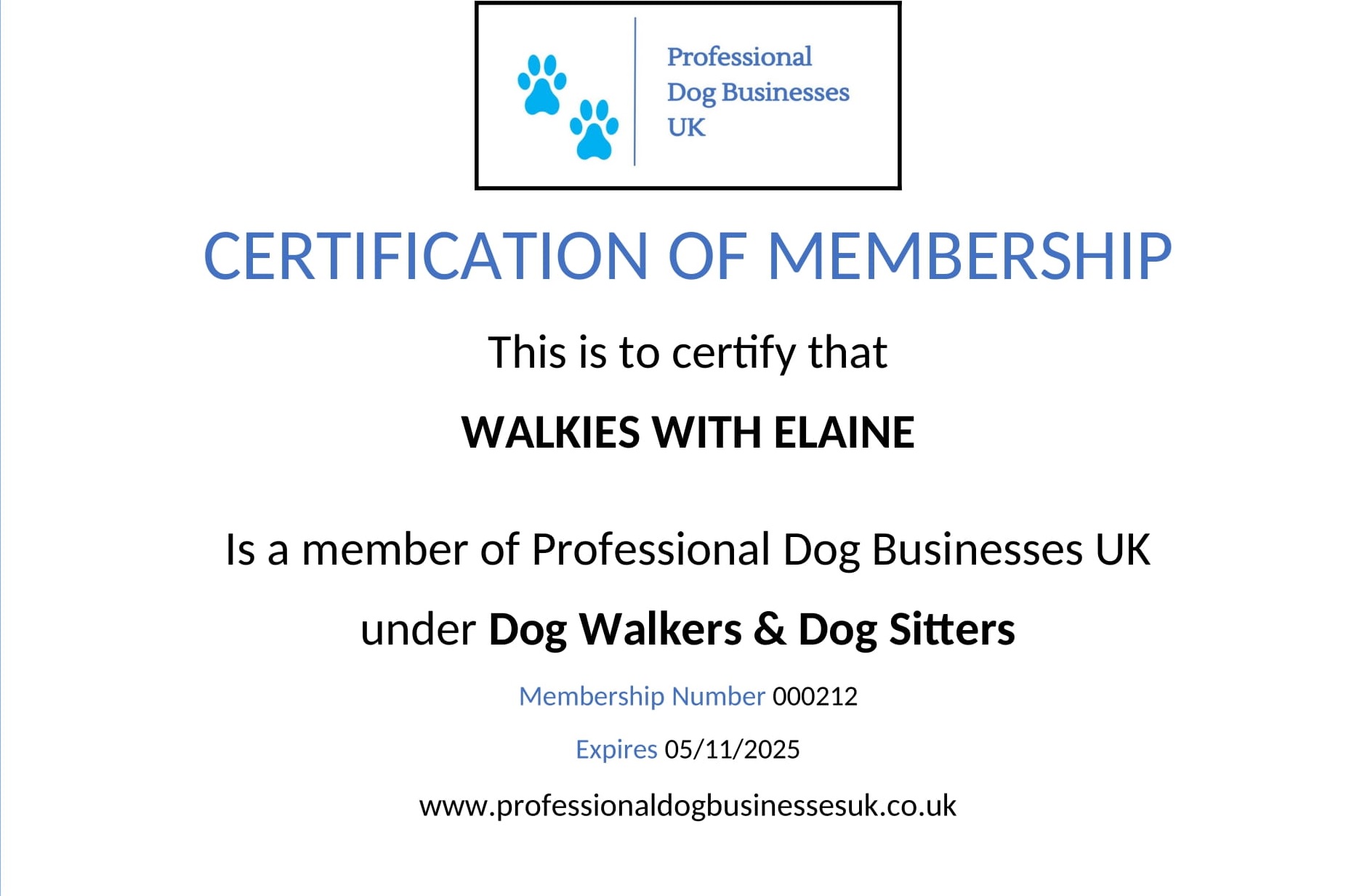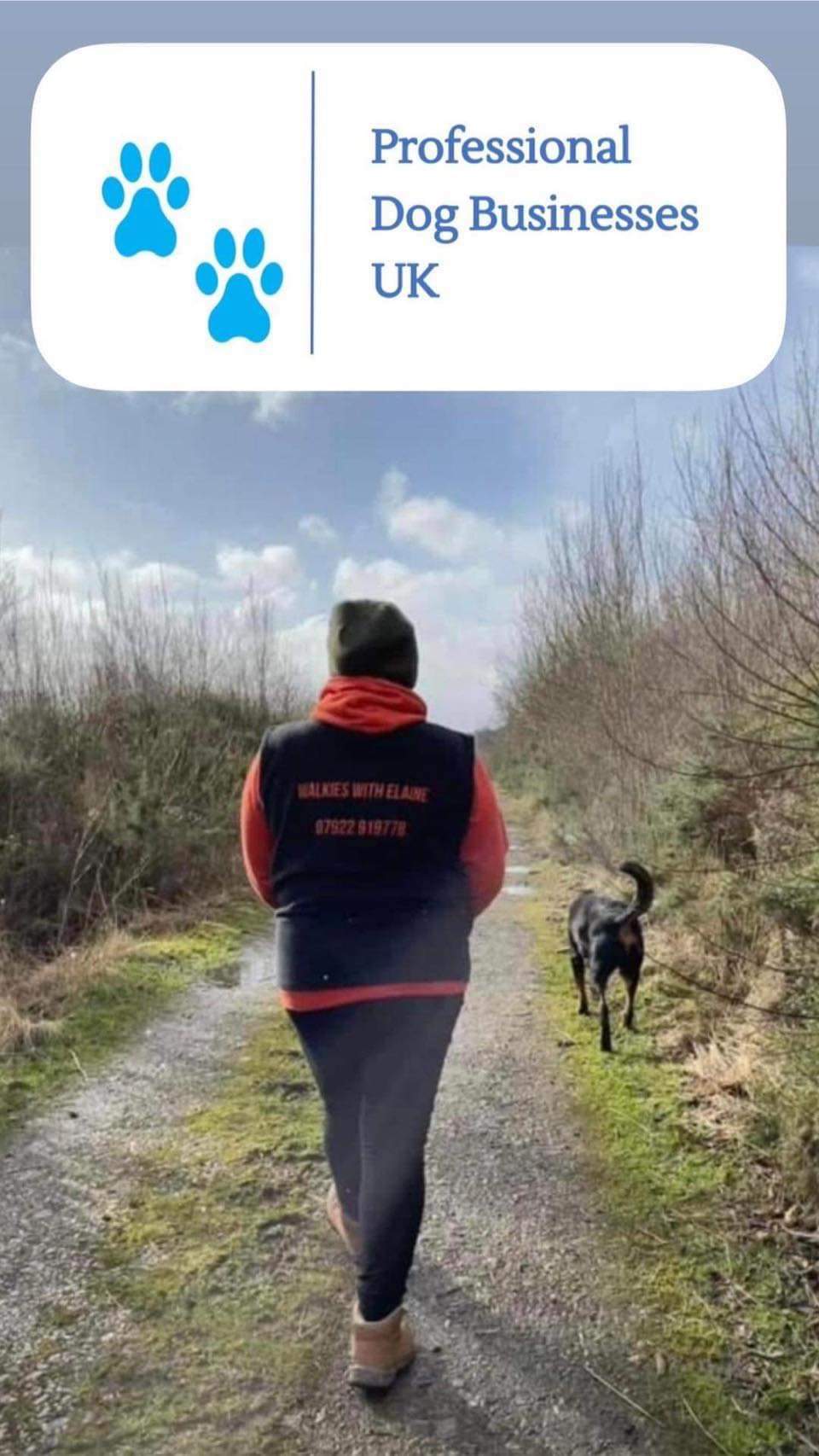 "My friend recommended Elaine to me and I am so happy to have her walking our dog. Completely trust her with him and she's amazing with him." RACHAEL REAY "Well what can I say about this fantastic lady! She is professional, trustworthy and the most important thing is she loves dogs and they have the best experience. I wouldn't trust just anyone with my pampered pooch, but Raven adores Elaine and enjoys her walks. Elaine will go above and beyond to ensure she knows your dog's likes/ dislikes, favourite walks and any important information. I highly recommend this service and thank you Elaine x" LINDA SCOTT-SAMSON "Highly recommend Elaine for dog walking and puppy visits. Its clear how much she cares about your dog and Coco absolutely loves her walks with her." CHLOE KING "Amazing. Met Elaine today and its fair to say my fur son loved her instantly, with the slobbery kisses he gave out. Elaine was friendly, warm and made me feel like our boy was in extremely safe hands. If anyone is looking for a dog walker who literally adores dogs, I can assure you Elaine is your person." KERRY MAY "I can thoroughly recommend Elaine and Jason. They really do treat your dogs like their own. My two dogs love it when she comes to take them out." CAROLINE PAGE "Elaine is the most caring person I know, she has a lot of love for dogs and they return it to her. She talks to them and they stop and smile at her. I trust her implicitly to look after my dog and he loves going out with her. Every photo I see with my dog, and others that she walks, is proof of how much they love her." ANN THOMPSON "I would highly recommend Elaine she is fantastic with all her dogs. Our Topsy just loves her." NICOLA MCGUIRE "There is only one word I can use and that is AMAZING!!! I have 2 precious doggos and there was only one thing I was looking for in a dog walker and that is that they must be big dog lovers not just an ordinary dog lover who will love them like their own and that's what you get with walkies with Elaine (and Jason). Elaine really takes pride in what she does and the service is second to none!! I feel that my dogs are safe with Elaine and that she will do everything in her power to protect them and give them the best care! There are lots of little things that Elaine does to keep the dogs safe which provides me with lots of reassurance and I don't have to worry about them... Another huge bonus is that Elaine is brilliant at taking photos of the dogs especially action shots I just love this!! My dogs love her especially Lady who has bonded with Elaine really well and I personally think she has Elaine wrapped around her little toe bean." AMIE COCHRANE
