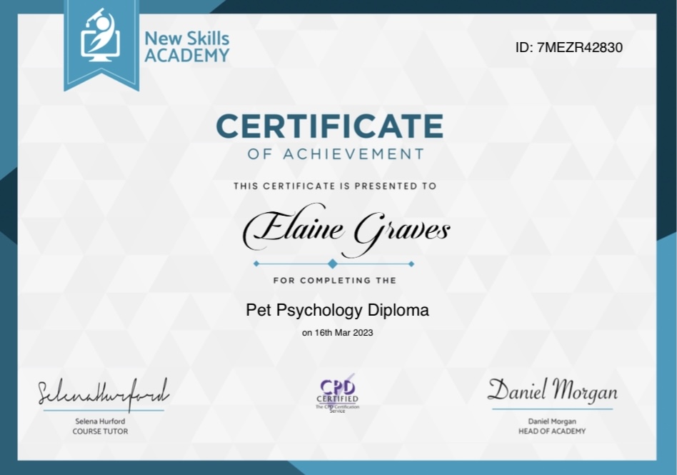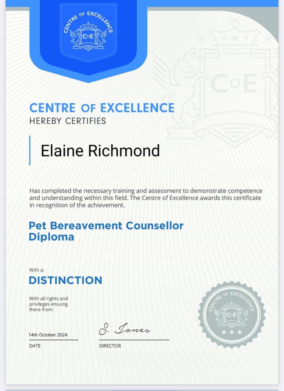 Nobody ever wishes to think about the day we say goodbye to our beloved pets. But when we do we are very often overcome with deep routed grief, often far more painful than anticipated. Our pets truly are our family members and the bond is so strong. Each pet being so special and unique. Walkies with Elaine specialises in pet bereavement. Obtaining a Pet Bereavement Counseller Diploma (with Distinction) in 2024, we are now able to offer free support to those who need it. With a strong background and experience in bereavement, having worked in funeral care and midwifery, this seems a very natural progression to use these skills and attributes in relation to our precious pets. Please get in touch if you or someone you know is struggling with the loss of a pet. There is so much support available and Walkies with Elaine can provide a safe place to help navigate your individual needs. You are never alone. Please see Facebook or Instagram for more information - Elaine Richmond Pet Bereavement Support or erpetbereavement@outlook.com to arrange face to face support, telephone or video calls or email/ messaging services.